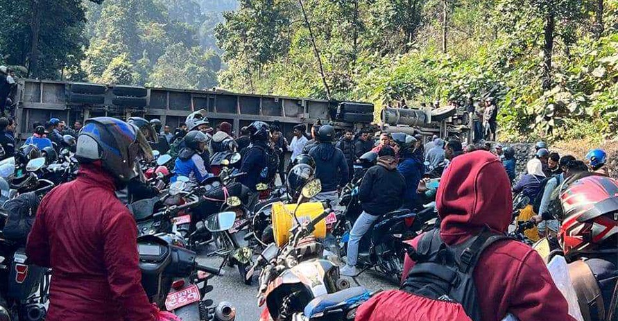 चुरियामाई उकालोमा मोबिल बोकेको कन्टेनर पल्टियो, सडक पूर्णरुपमा अवरुद्ध