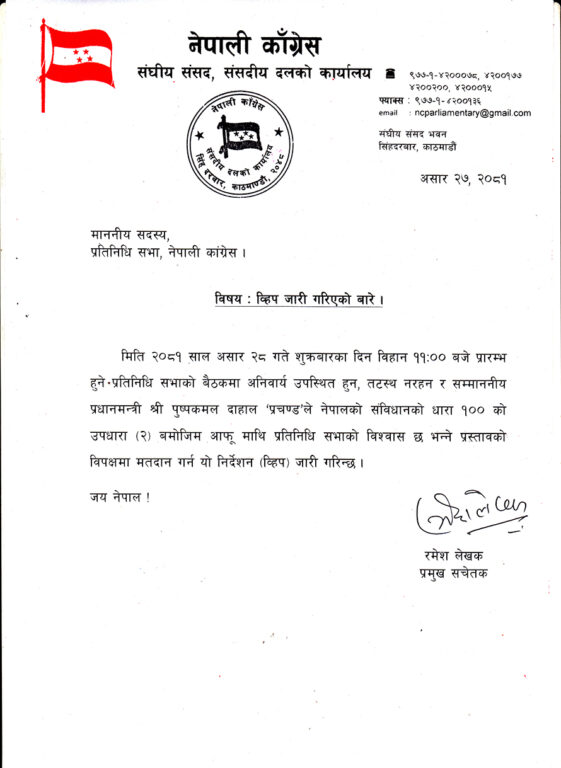‘असार २८ गते विहान ११ बजे बस्ने प्रतिनिधि सभाको बैठकमा नेपाली कांग्रेसका माननीय सदस्यहरूलाई अनिवार्य उपस्थित हुन, तटस्थ नरहन र सम्माननीय प्रधानमन्त्री पुष्पकमल दाहाल ‘प्रचण्ड’ले आफूमाथि प्रतिनिधि सभाको विश्वास छ भन्ने प्रस्तावको विपक्षमा मतदान गर्न ह्वीप जारी गर्नुभएको छ,’ लेखेकको सचिवालयले जारी गरेको विज्ञप्तिमा भनिएको छ ।