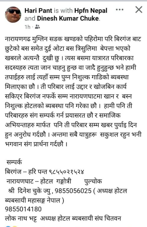 त्यहाँ सम्म पुगेर उद्दार तथा खोजबिन कार्य सकिएर पनि वीरगञ्ज नफर्के सम्म त्यही खाना र बासको समेत निशुल्क व्यवस्था मिलाईने पन्तले बताए । उक्त दुर्घटनामा परेका परिवारजनले होटल व्यवसायी संघ वीरगञ्जका अध्यक्ष हरि पन्तको मोवाईन नम्बर ९८५५०२१५२४, होटल ब्यबसायी महासङ्ग नेपालका अध्यक्ष एवम नारायणघाट स्थित होटलगङ्गोत्री पुल्चोकका संचालक दिनेश चुकेको सम्पर्क नम्बर ९८५५०५६०२६ र होटल ब्यबसायी संघ चितवनका अध्यक्ष लोकनाथ भट्ट अध्यक्षको मोवाईल नम्बर ९८५५०१४१८० मा फोन गरेर सहयोग लिन अपिल गरिएको छ ।