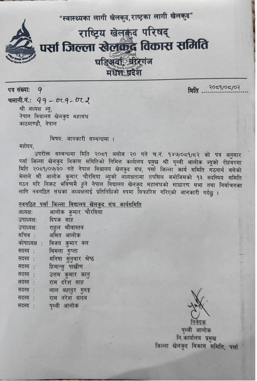 गएको असोज २० गतेको चलानी नं. १४७ को पत्र अनुसार पर्सा जिल्ला खेलकुद विकास समितिको निमित्त कार्यालय प्रमुख पृथ्वी आलोकको रोहवरमा कार्तिक ३० गते भएको भेलाले आलोक कुमार चौरसियाको अध्यक्षतामा १३ सदस्यीय समिति गठन गरेको छ ।