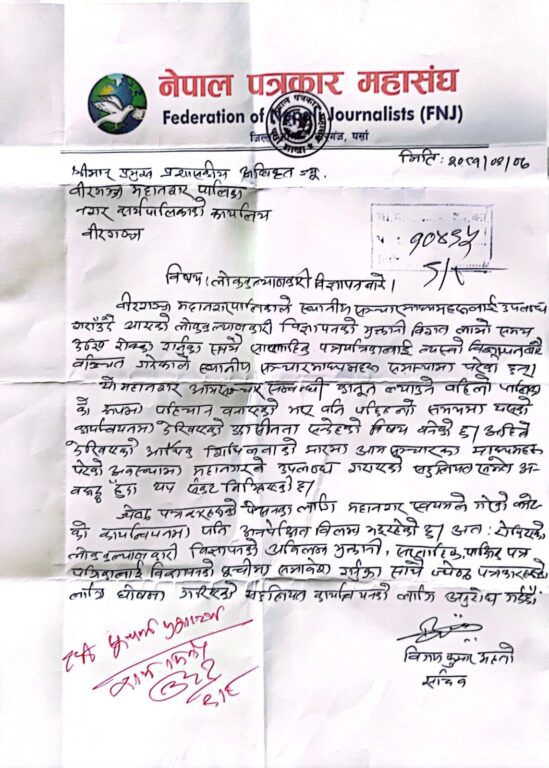 वीरगन्ज महानगर आमसञ्चार सम्बन्धी कानून ल्याउने पहिलो स्थानीय तहको रूपमा पहिचान बनाएको भएपनि पछिल्लो समयमा यसको कार्यान्वयनमा देखिएको उदासिनता सन्देहको विषय बनेको महासंघका सचिव विजय महतोले हस्ताक्षर गरेको ज्ञापनपत्रमा उल्लेख गरिएको छ ।
