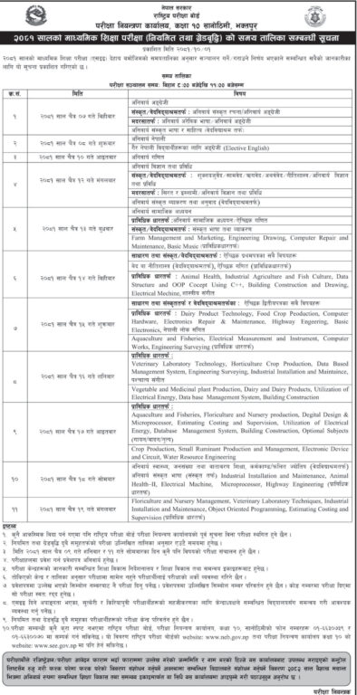 परीक्षा तालिकाअनुसार पहिलो दिन चैत ७ गते अनिवार्य अंग्रेजी, ८ गते अनिवार्य नेपाली, चैत १० गते अनिवार्य गणित, १२ गते अनिवार्य विज्ञान विषयको परीक्षा हुनेछ ।