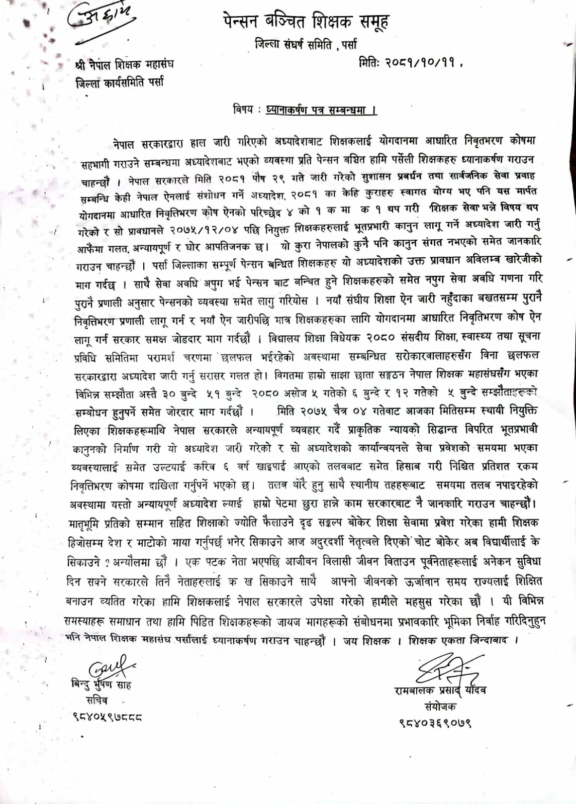 पेन्सन बञ्चित शिक्षक समुह पर्साका संयोजक राम बालक यादवको नेतृत्वमा पर्साका पेन्सन बञ्चित शिक्षकहरूको समुहले उक्त ध्यानाकर्षण पत्र बुझाउदै अध्यादेशमा गरिएको व्यावस्था विभेदकारी भएको भन्दै खारेजीको माग गरेको हो । ध्यानाकर्षण पत्र बुझ्दै शिक्षक महासंघ पर्साका अध्यक्ष तीर्थराज यादवले सरकार र शिक्षक महासंघ बीच विगतमा भएका सबै सम्झौताहरु अक्षरःस ऐनमा नसमेटिए ठूलो आन्दोलन हुने चेतावनी दिँदै ऐन जारी भएको मितिभन्दा अगाडि नियुक्त भएका शिक्षकहरूलाई पुरानै पेन्सन प्रणाली अनुसार पेन्सन लागू गर्नु पर्ने भन्दैअध्यक्ष यादवले शिक्षा मन्त्री विद्या भट्टाराईले मौखिक रूपमा भन्दैमा शिक्षकहरू विश्वास नगर्ने बताए ।