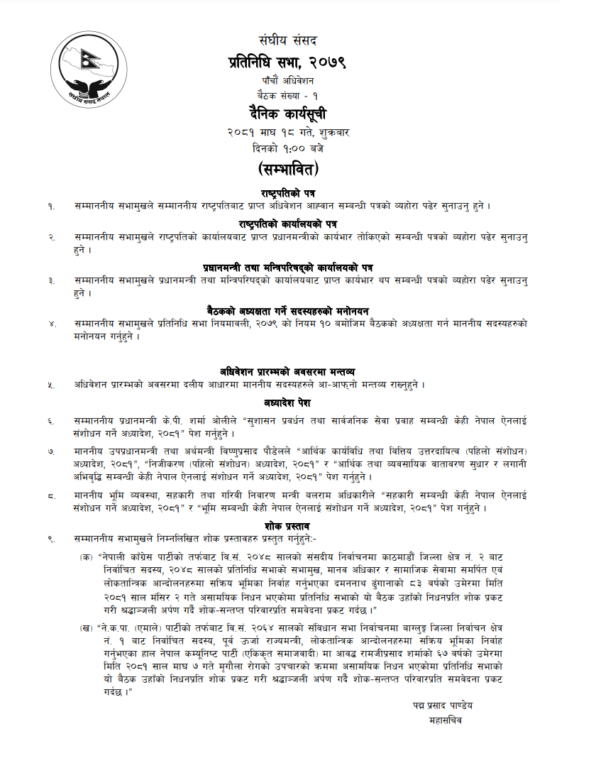 बैठकमा सभामुखले विभिन्न शोक प्रस्ताव प्रस्तुत गर्ने सम्भावित कार्यसूची पनि छ ।