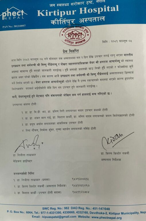मेयर आचार्यलाई भने केही दिन अझै अस्पतालमा राखिने भएको छ। आचार्यको पहिलेदेखि नै उच्च रक्तचापको समस्या भएकाले हृदयरोग विशेषज्ञसँग परामर्श भइरहेको र केही दिन थप उपचार गर्नुपर्ने चिकित्सकले बताएको अस्पतालले जारी गरेको बिज्ञप्तिमा भनिएको छ।