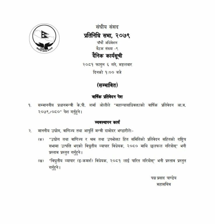 साथै, उद्योग तथा बाणिज्य र श्रम तथा उपभोक्ता हित समितिको प्रतिवेदनसहितको राष्ट्रियसभामा उत्पति भएको विद्युत ब्यापार बिधेयक, २०८० माथि छलफल गरियोस् भन्ने प्रस्ताव प्रस्तुत गर्ने तथा बिधुतीय ब्यापार (ई–कमर्श)बिधेयक, ०८१ लाई पारित गरियोस् भनि प्रस्ताव प्रस्तुत गर्ने महासचिव पदमप्रसाद पाण्डेले सार्बजनिक गरेको सम्भावित कार्यसूचीमा उल्लेख गरिएको छ।