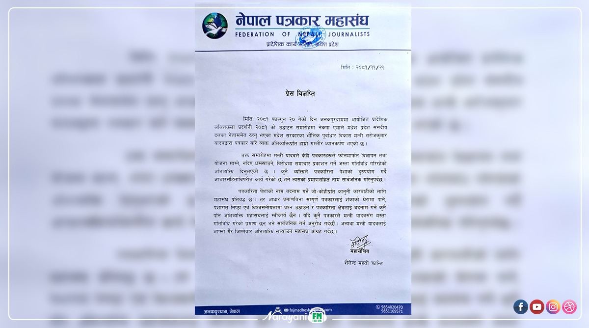 मधेस प्रदेशका मन्त्री सरोज यादवको अभिव्यक्ति प्रति पत्रकार महासंघ र प्रेस सेन्टरको आपत्ति
