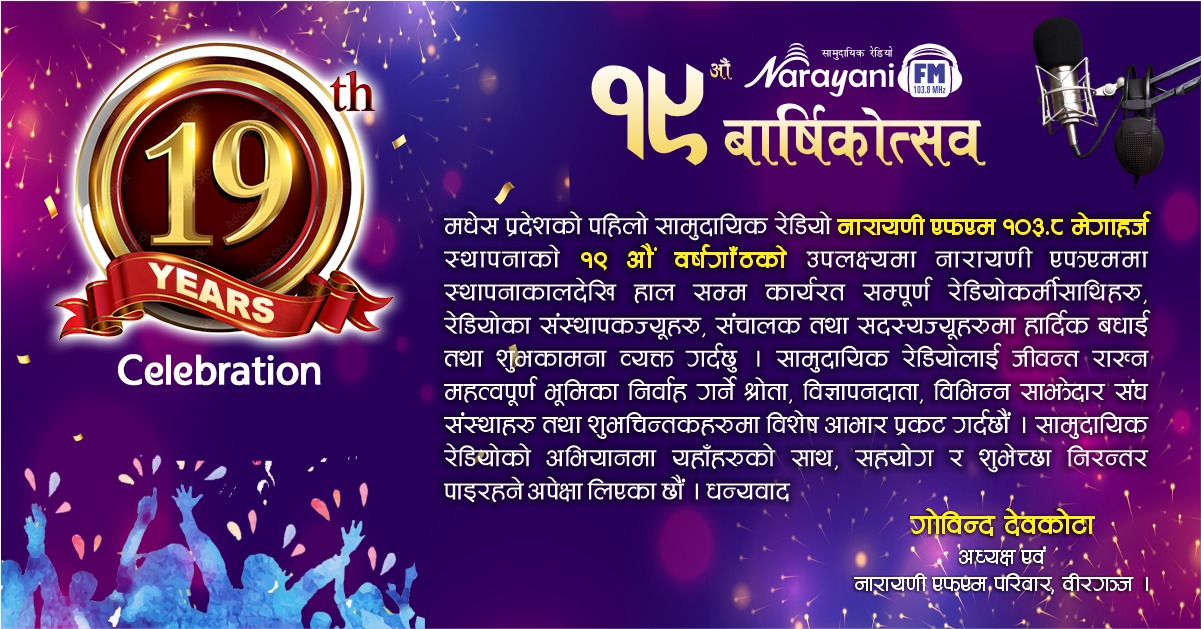 वीरगञ्जबाट प्रसारण हुने नारायणी एफ.एम आजबाट १९ औं बर्षमा प्रवेश